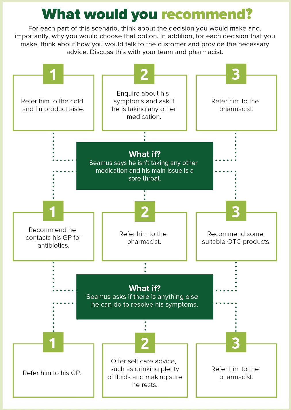 Seamus comes into the pharmacy with a cold and is looking for some support from the pharmacy.