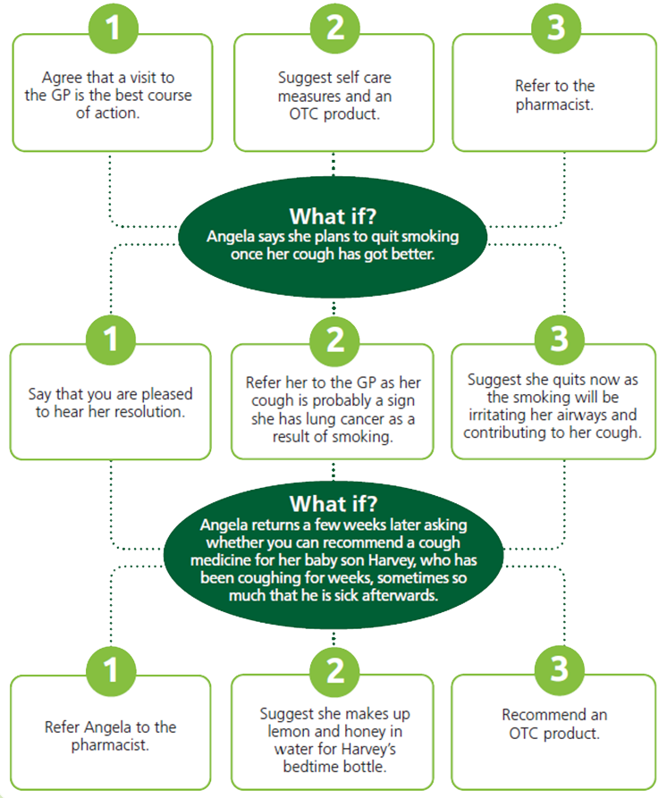 For each part of this scenario, think about the decision you would make and, importantly, why you would choose that option. In addition, for each decision that you make, think about how you would talk to the customer and provide the necessary advice, and discuss this with your team and pharmacist.