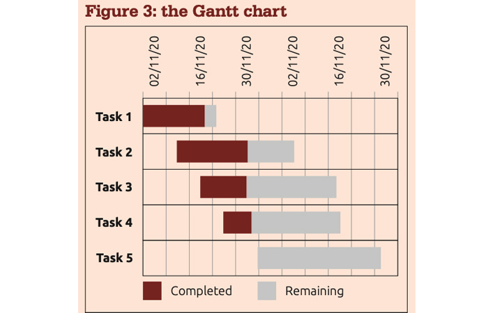 Of all the project management tools, arguably the most useful and the easiest to understand is the Gantt chart (Figure 3). This horizontal bar chart graphically displays the time relationship between the steps in a project. It is named after its inventor, Henry Gantt, an American engineer who pioneered its use in the early 1900s.